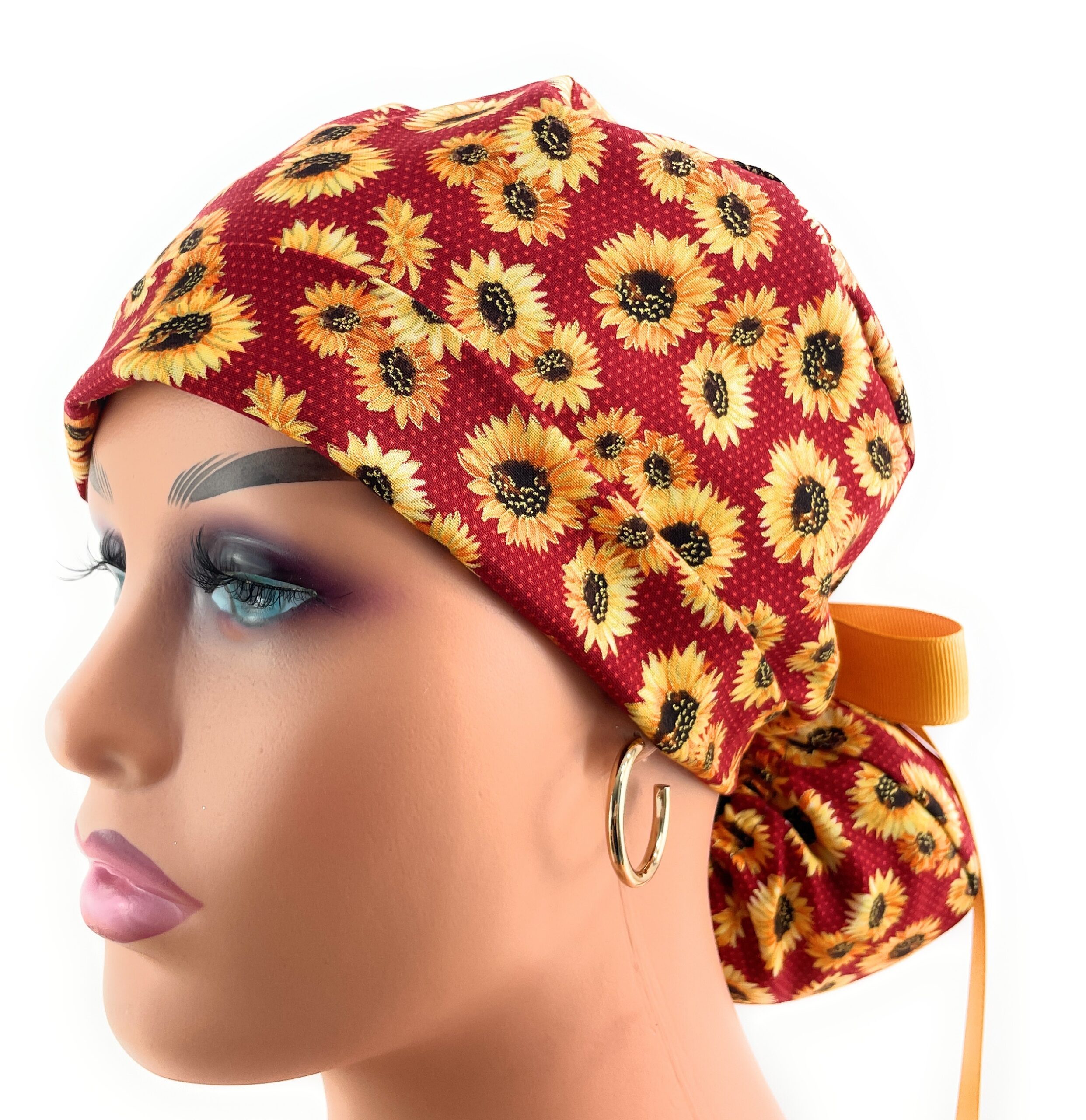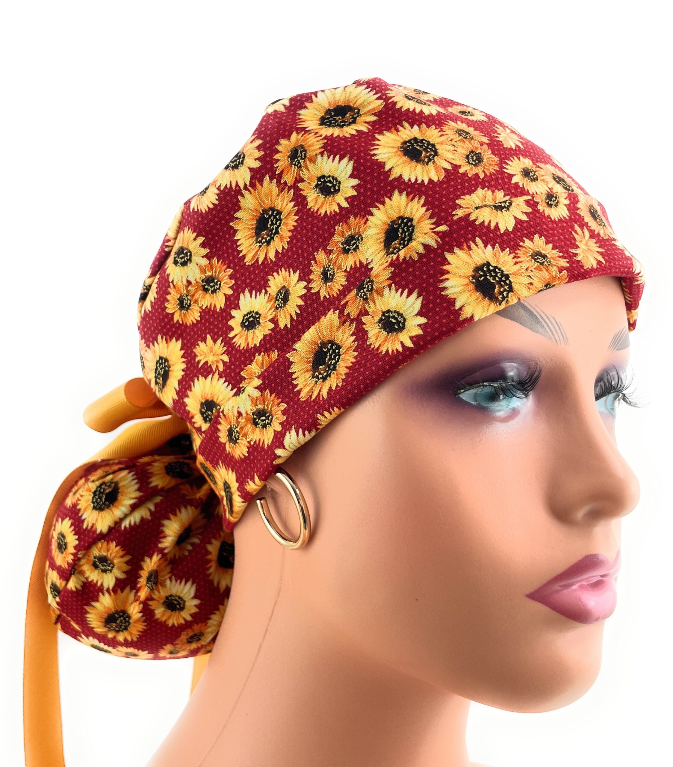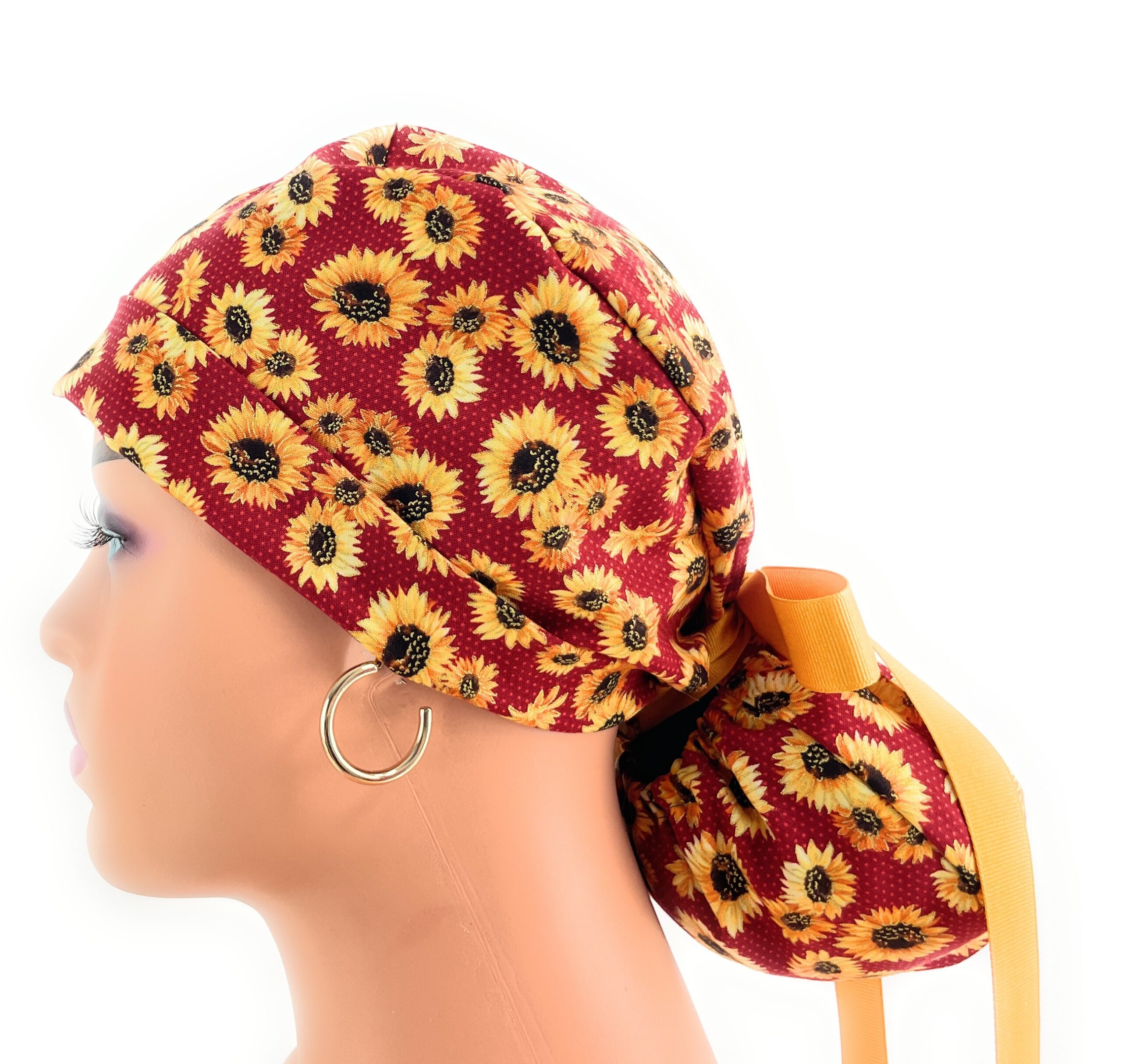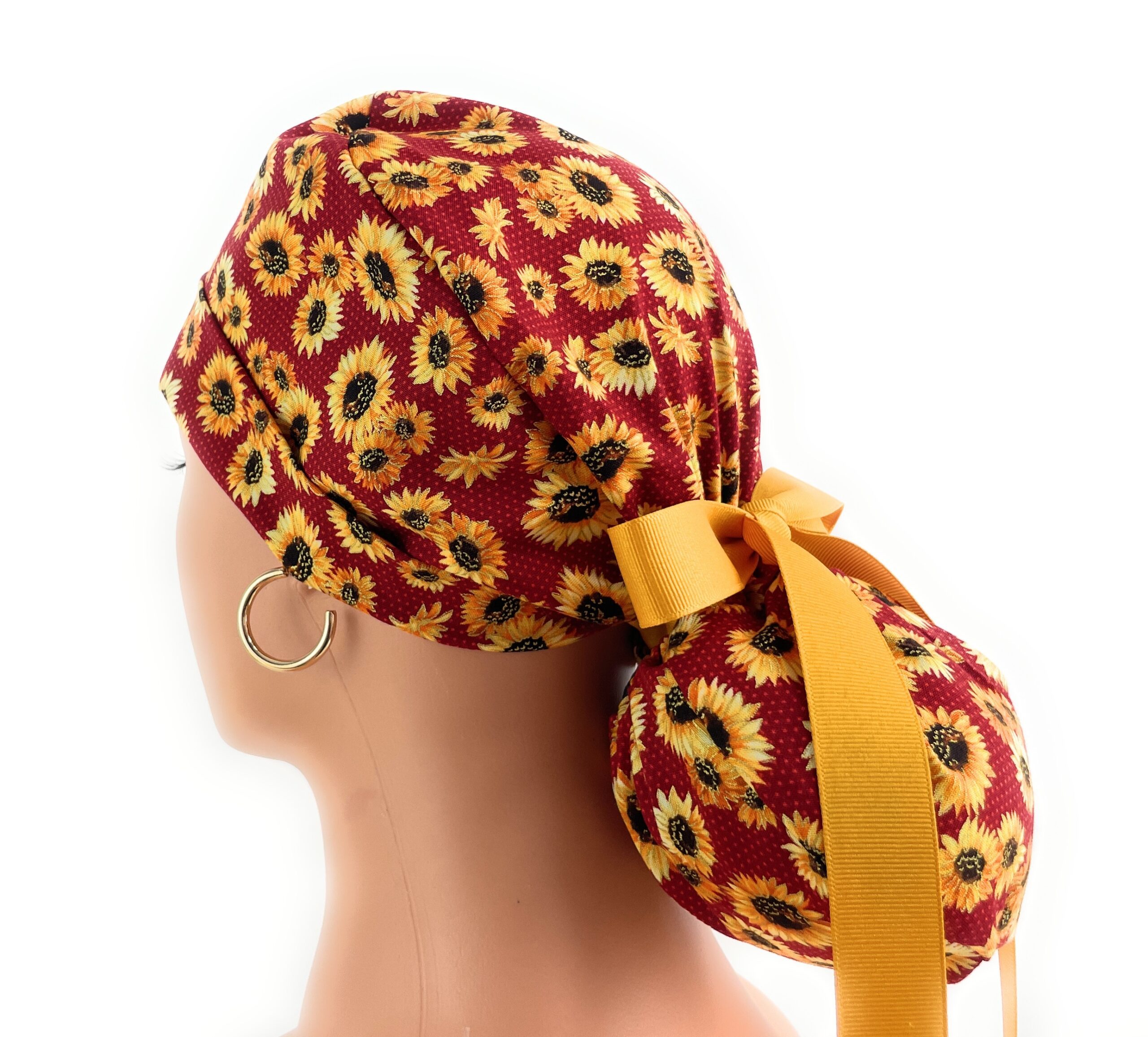 Double Sided Ponytail Medical Scrub Cap – Sunflowers On Burgundy