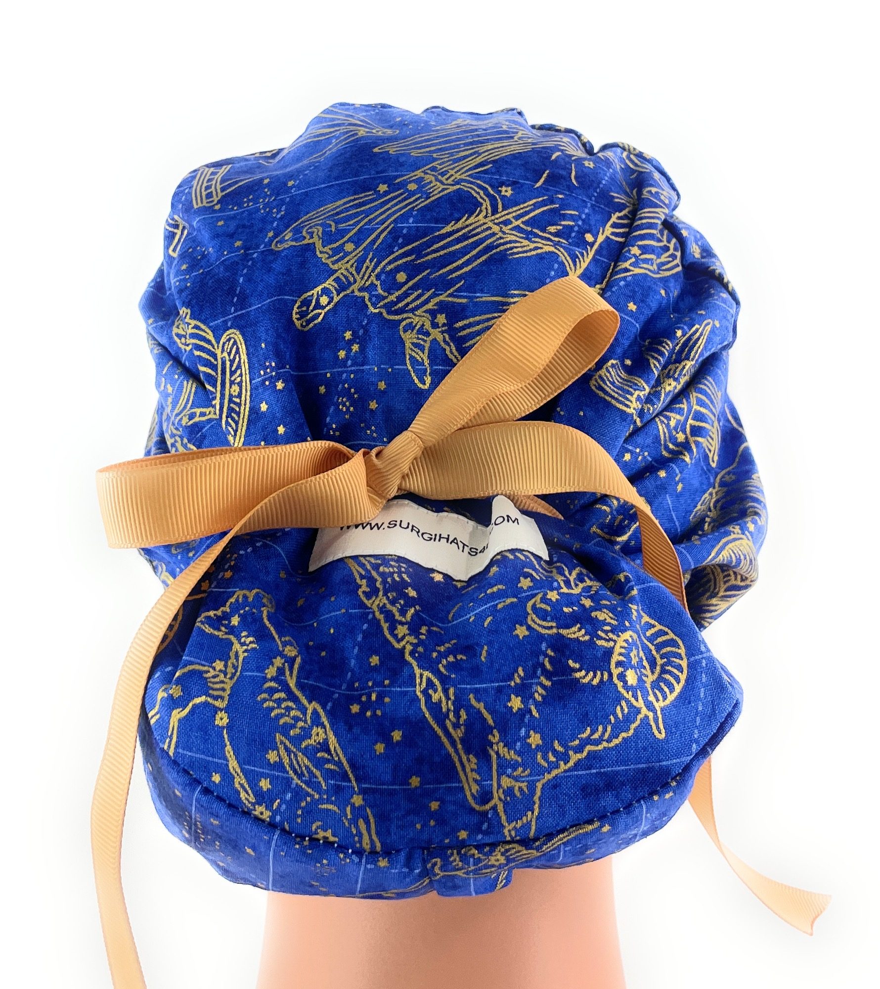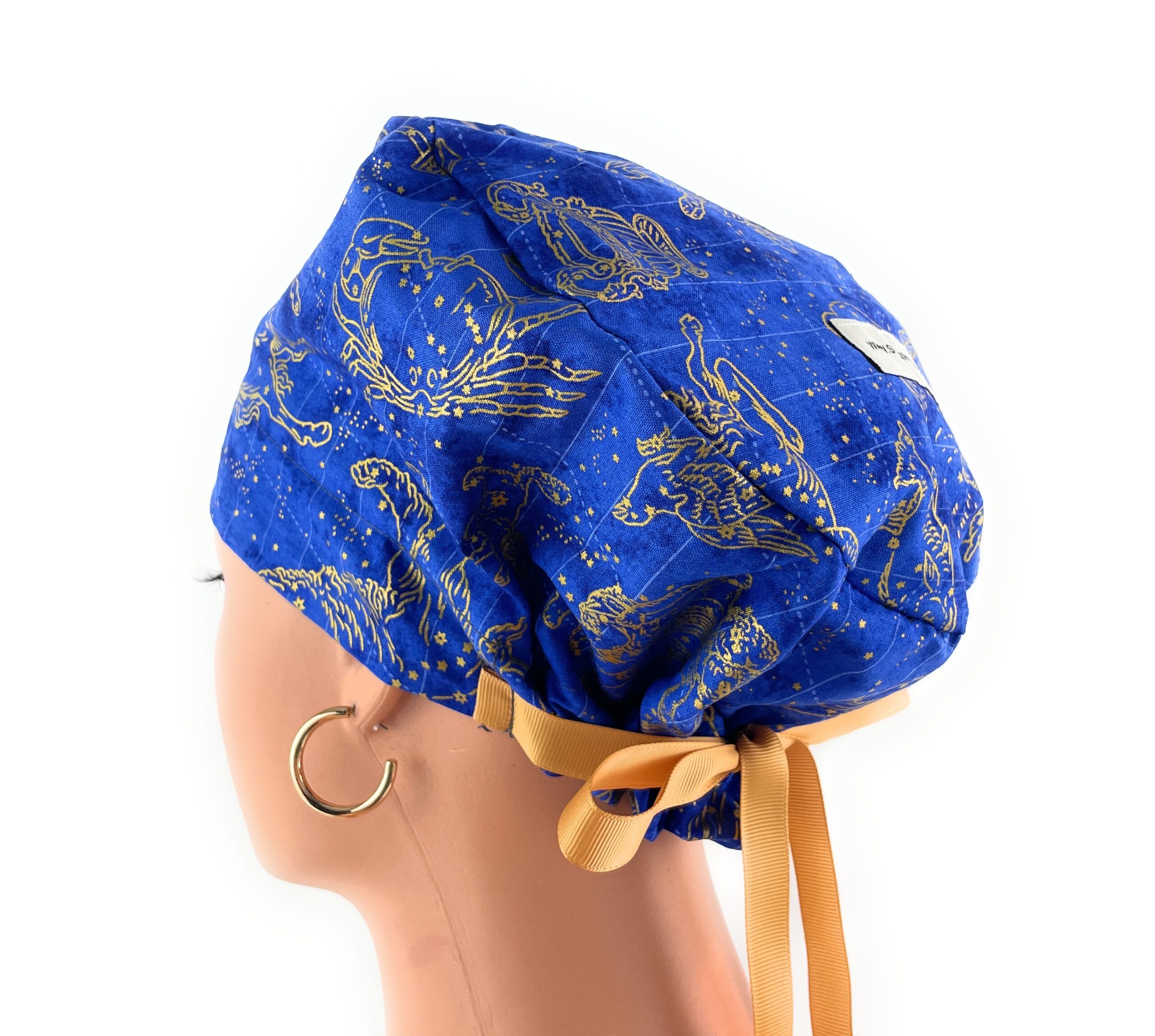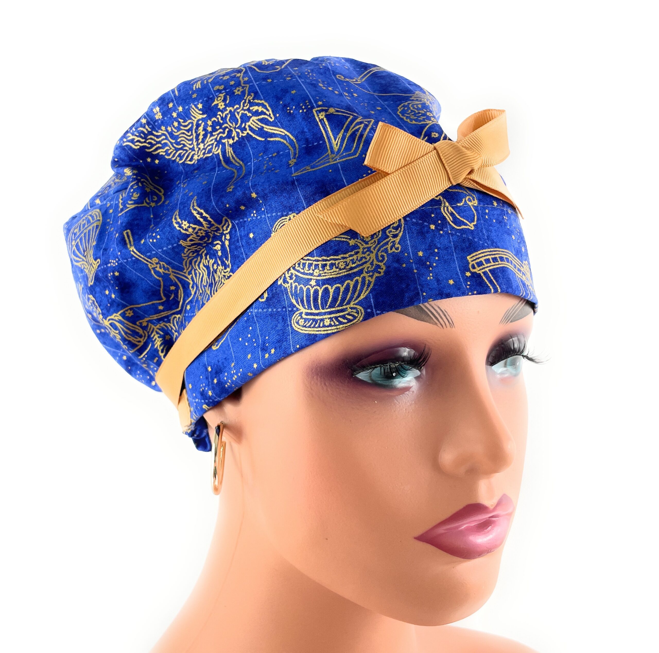 European Style Scrub Cap – (Grosgrain Ribbon) – (No Ribbon) – Zodiac Signs – Cobalt/Gold