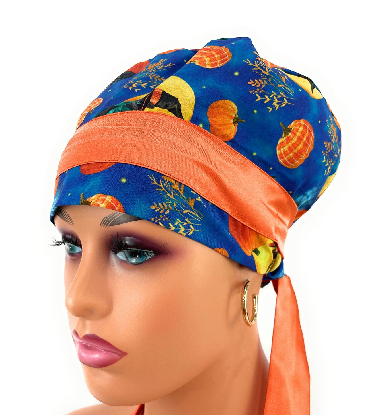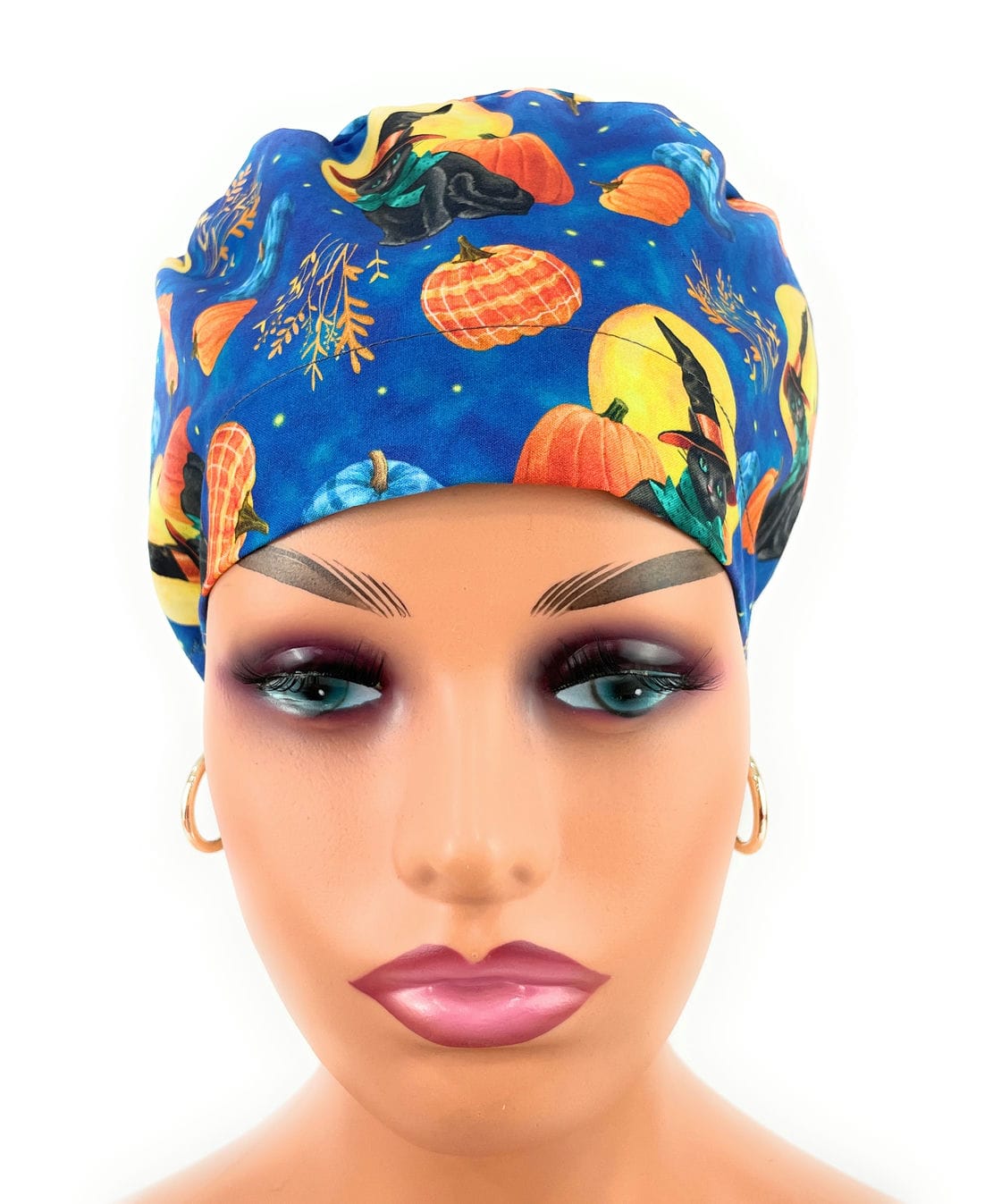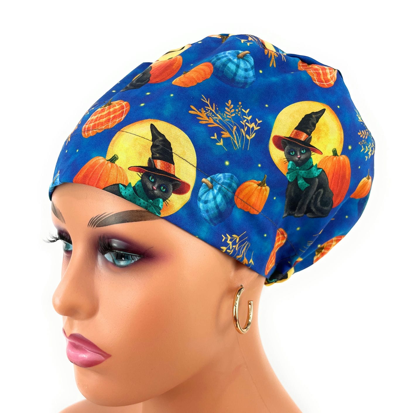European Style Scrub Cap – (Sateen Ribbon) Abra-CAT-Dabra – Black Cat Moon – Cobalt
