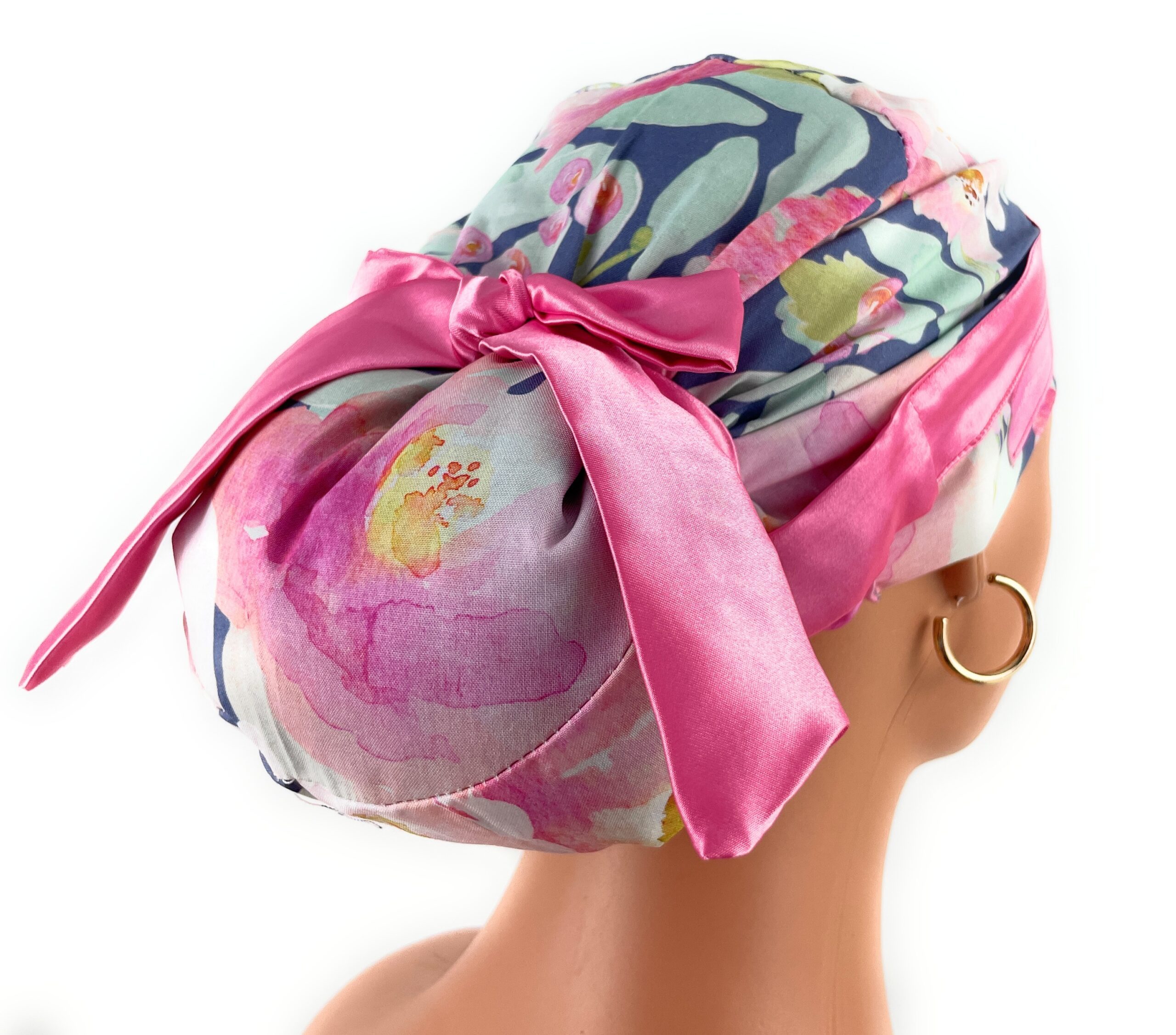 European Style Scrub Cap – (Sateen Ribbon) (No Ribbon) – Blushing Floral in Fuchsia on Navy