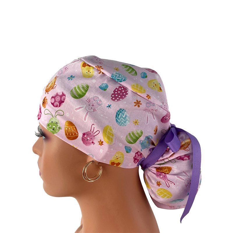 Ponytail Medical Scrub Cap – Happy Easter Bunies – Egg Hunt – Pastel Pink