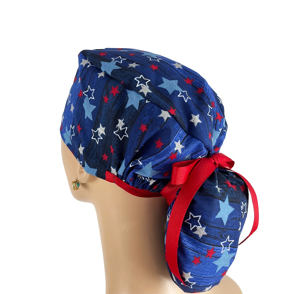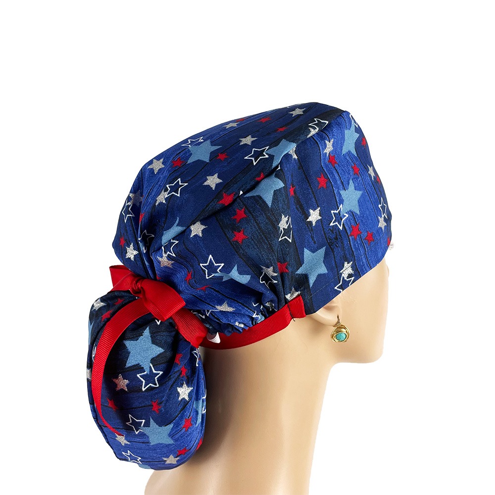 Ponytail Medical Scrub Cap – Red White Stars On Blue