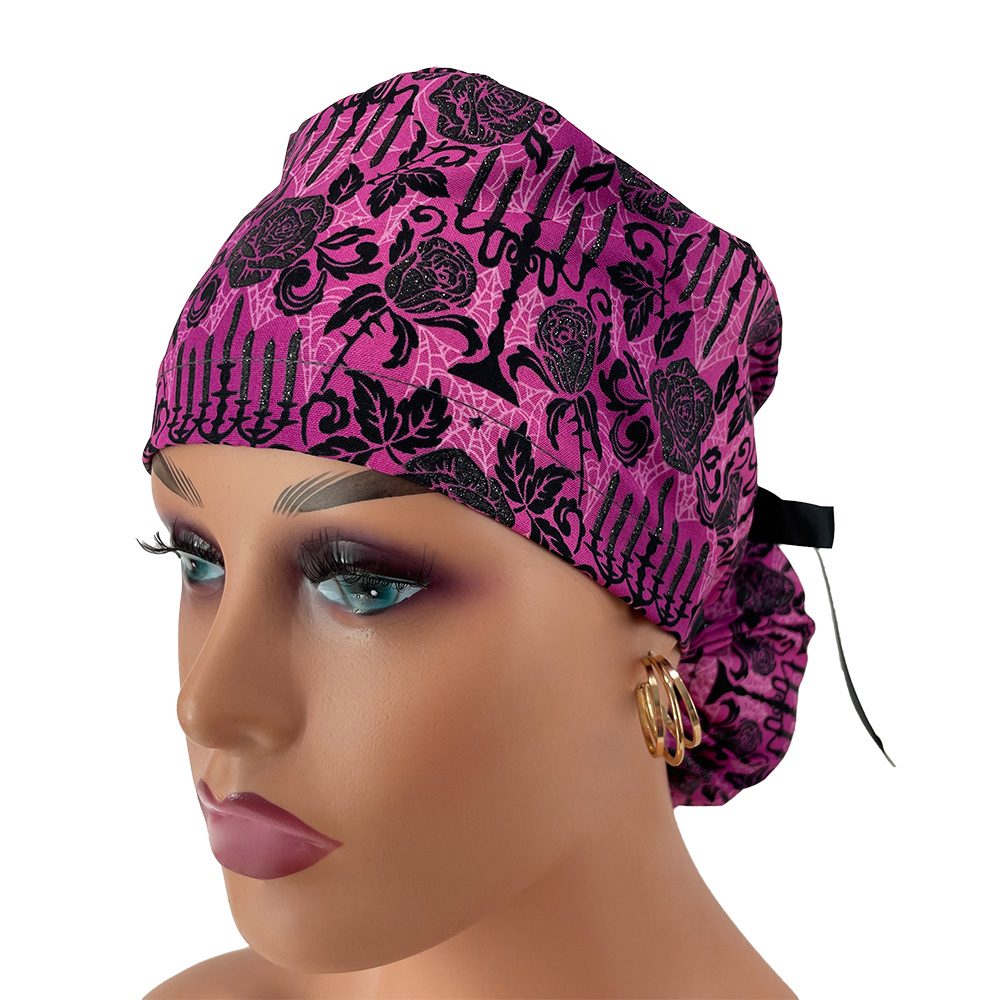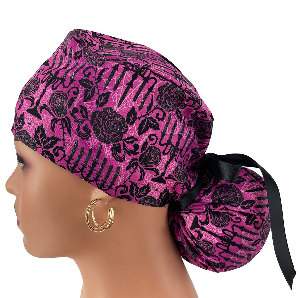 Ponytail Medical Scrub Cap – Totally Twilight-Gothic Halloween-Black/Fuchsia/Glitter