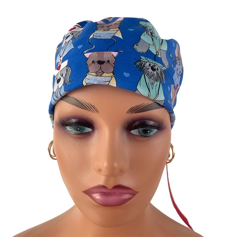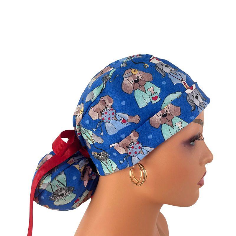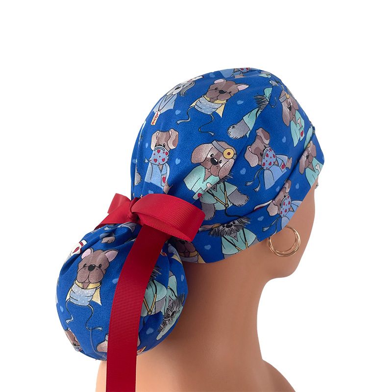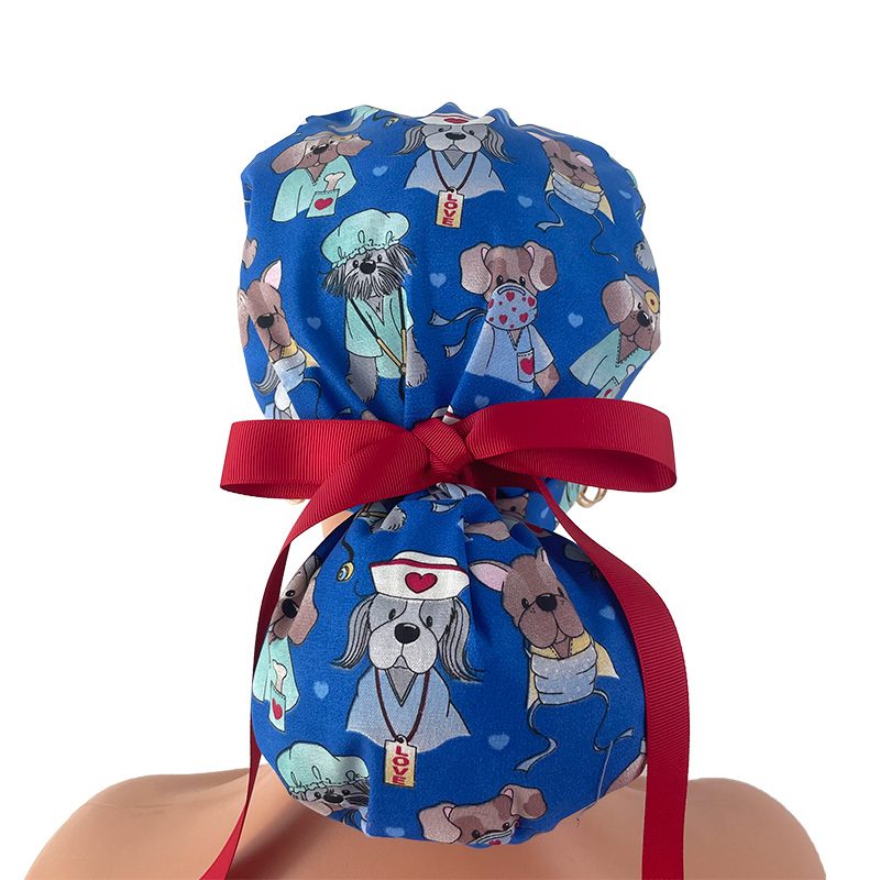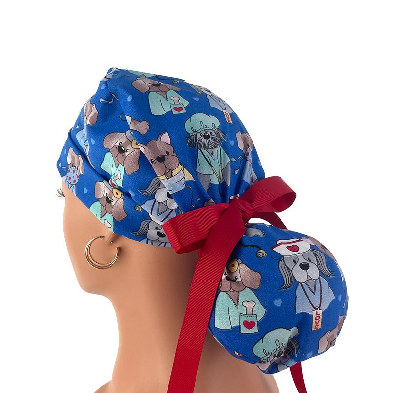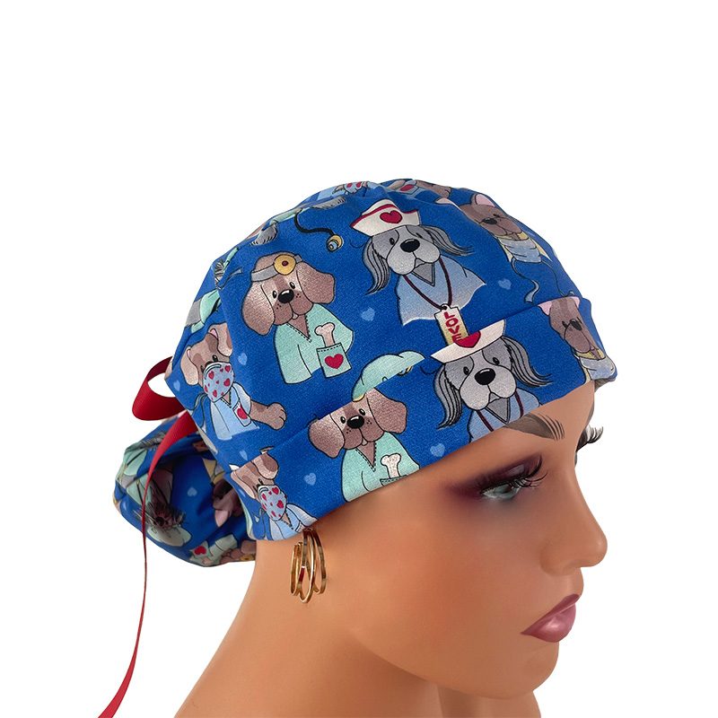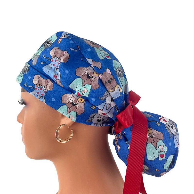 Turn Up Ponytail Medical Scrub Cap. Doggies at The Rescue