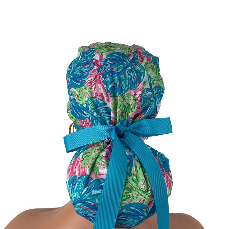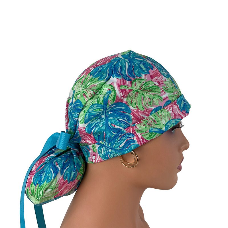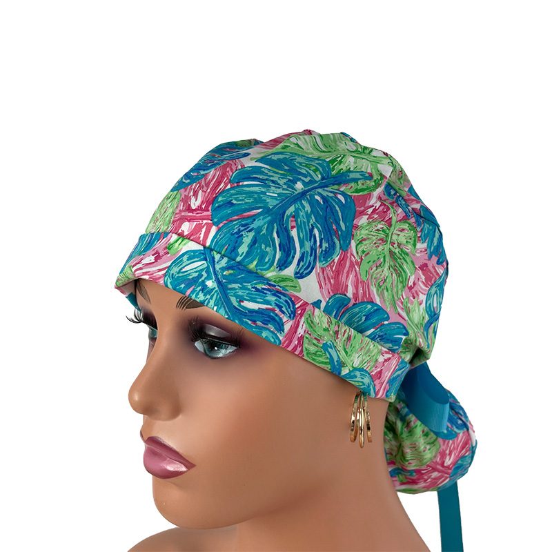 Turn Up Ponytail Medical Scrub Cap – Fantastic Forest – Lush & Lovely Leaves