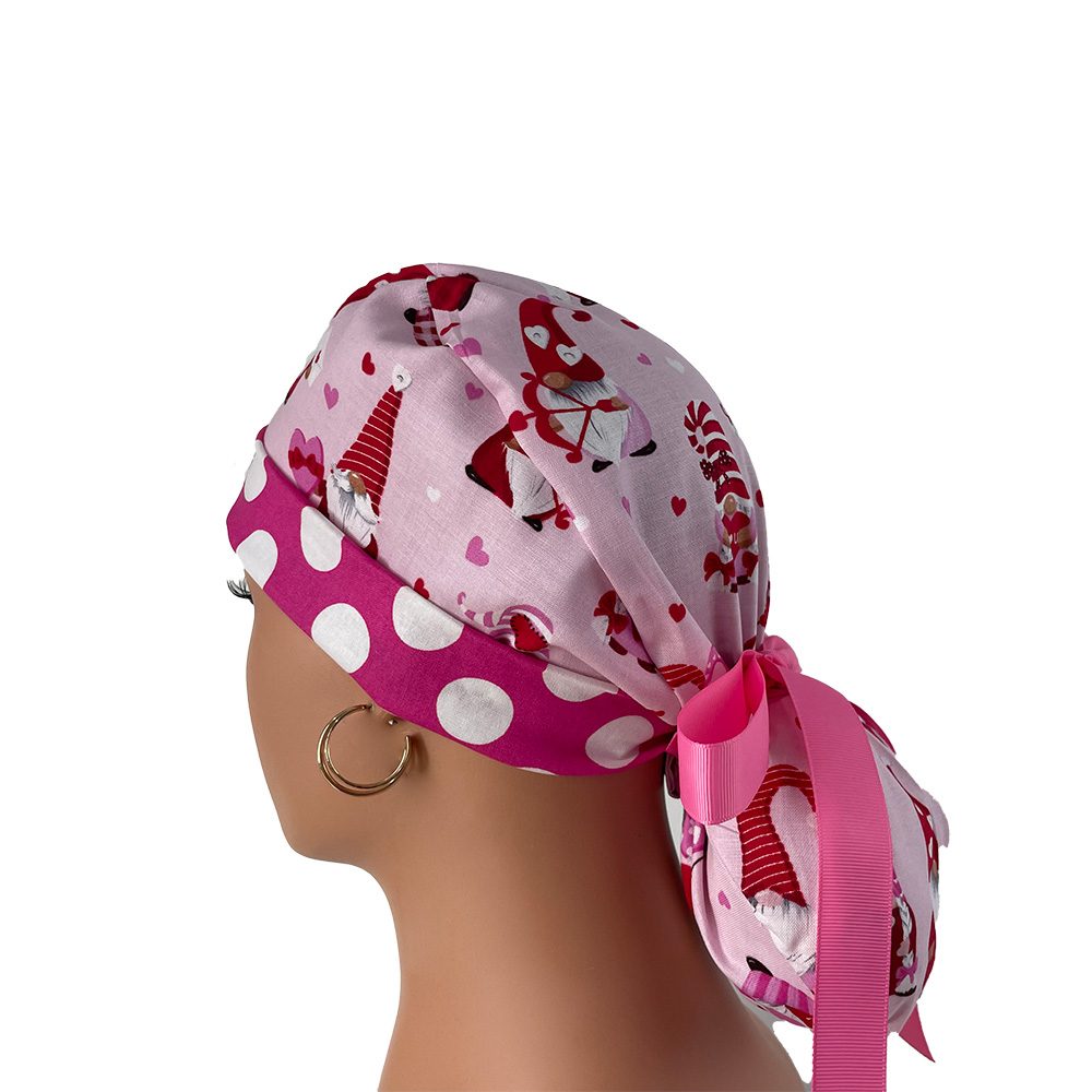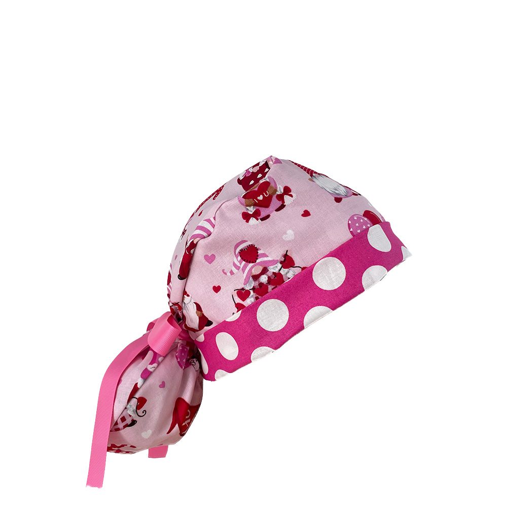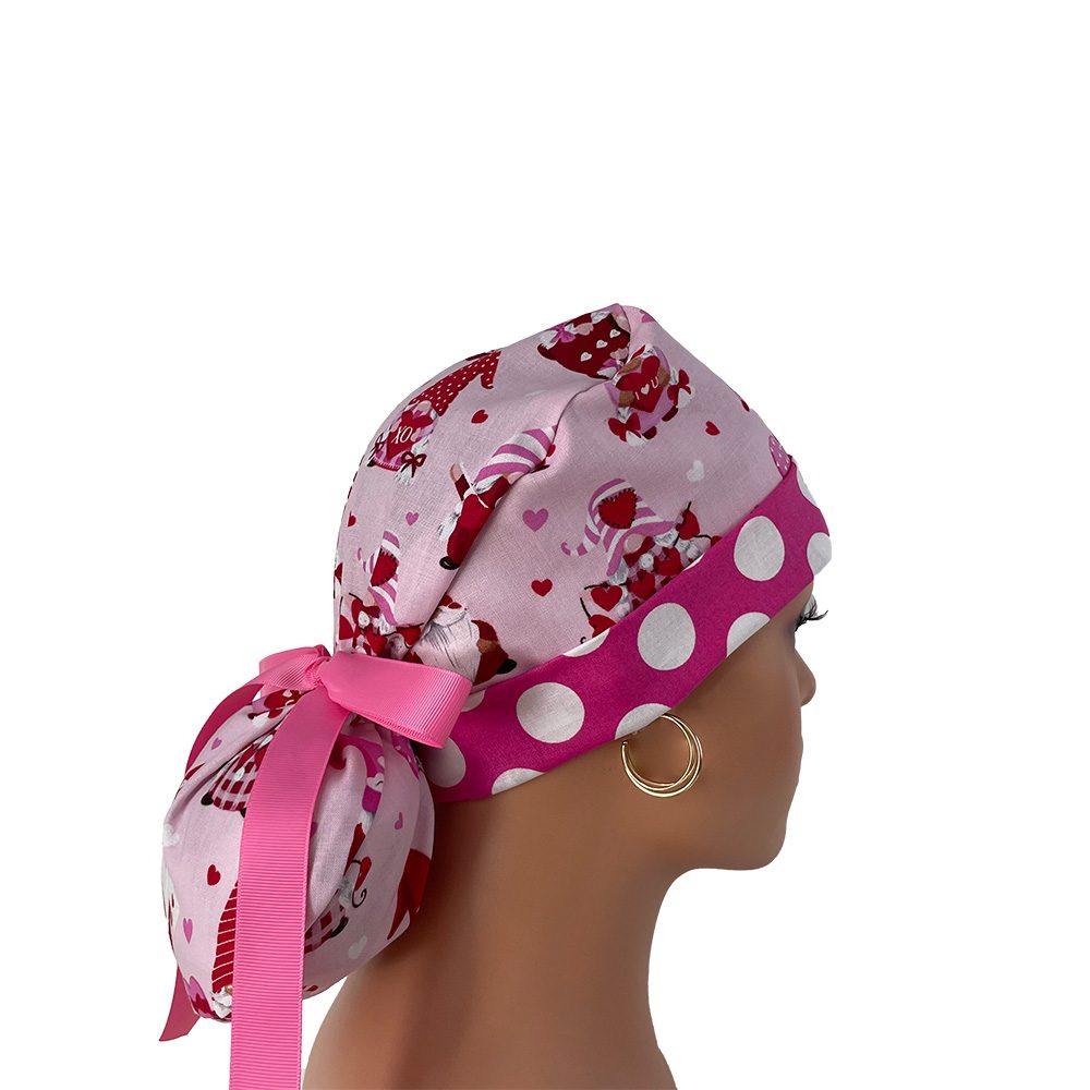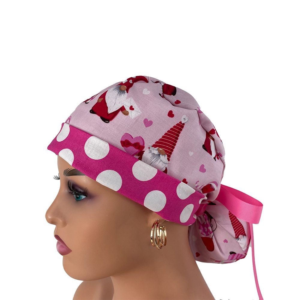 Turn Up Ponytail Medical Scrub Cap – Gnomie Love – Kisses & Hugs/ White/Pink Dots