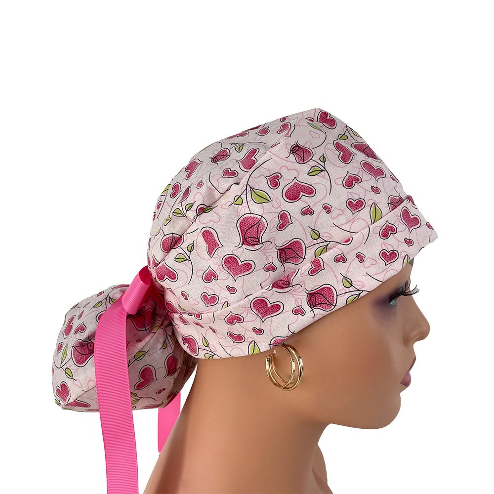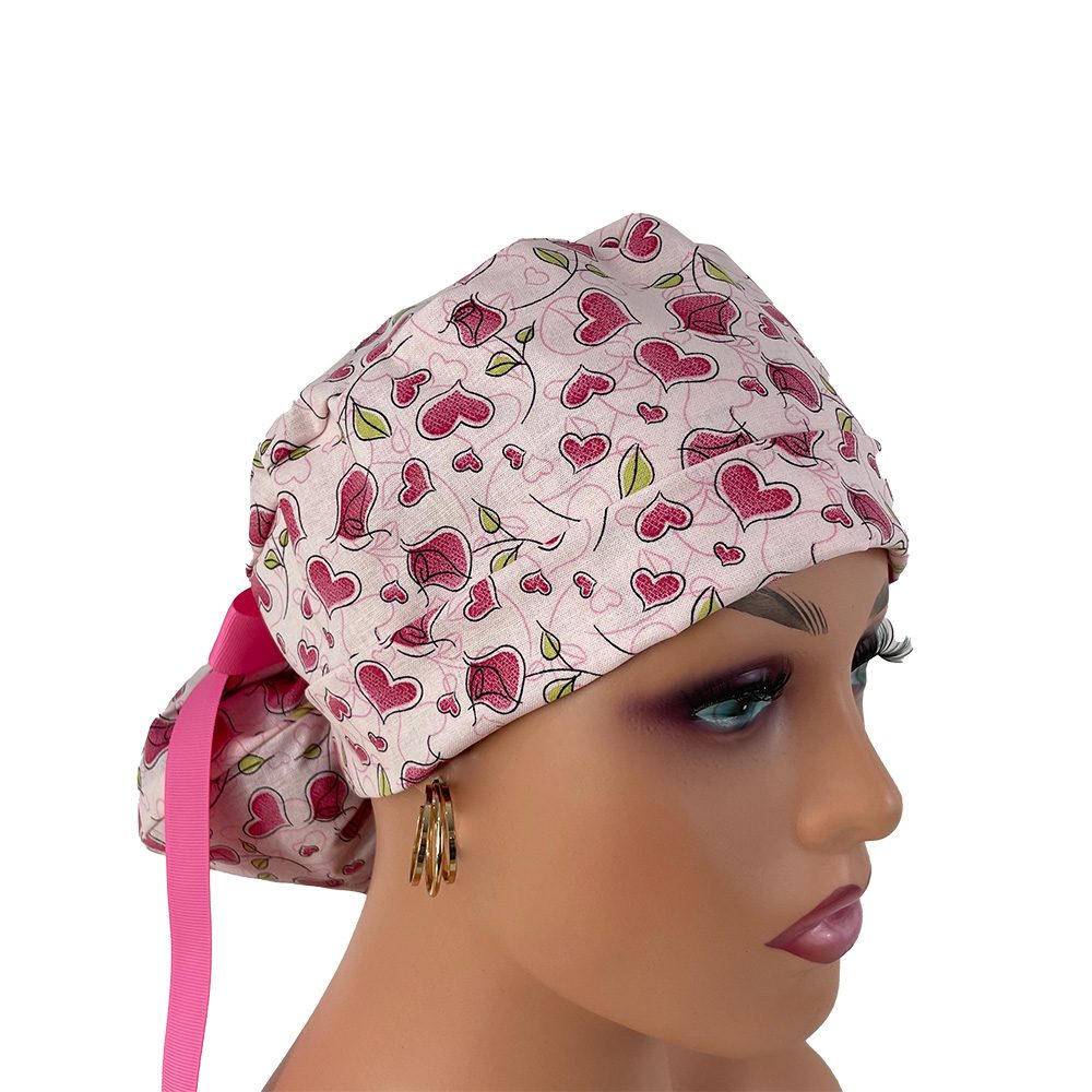 Turn Up Ponytail Medical Scrub Cap – Hearts N Roses Pink Valentine’s Day