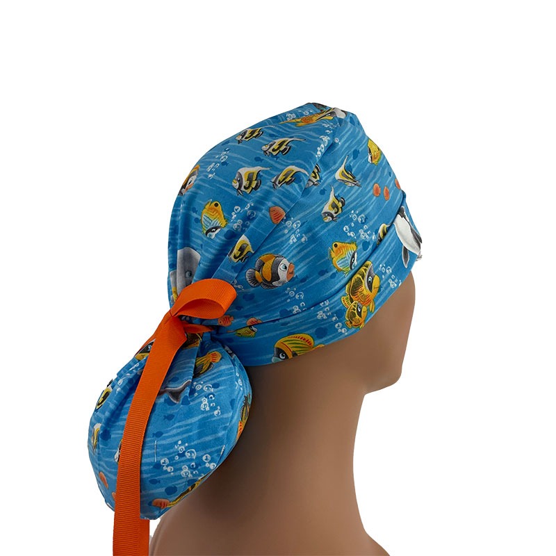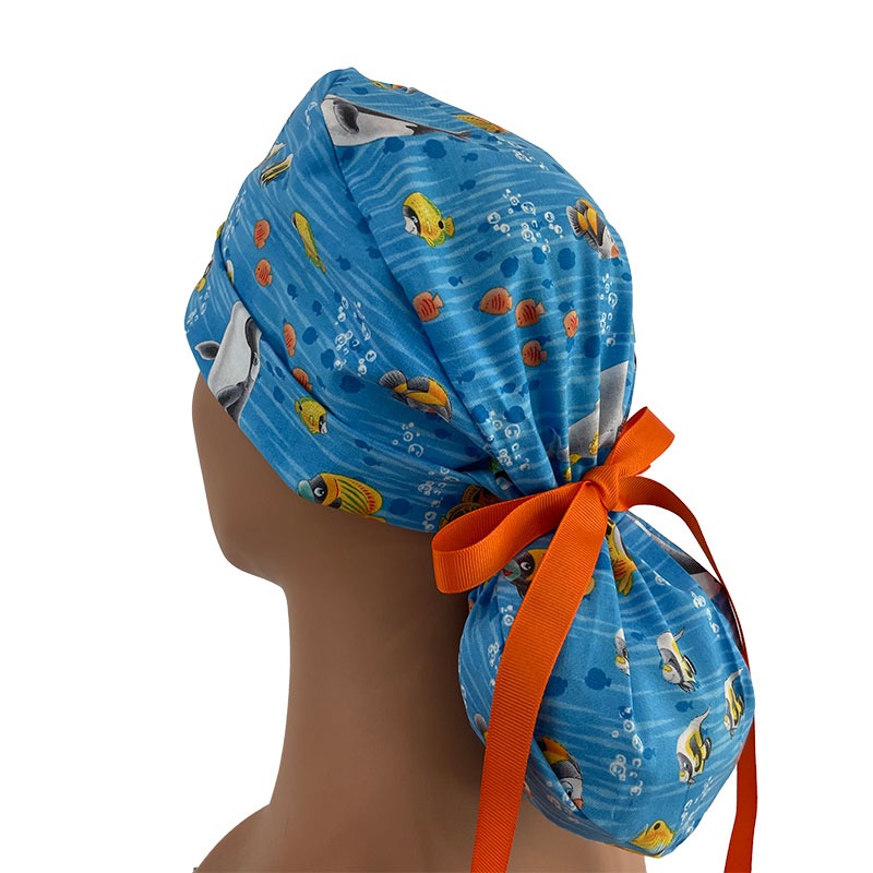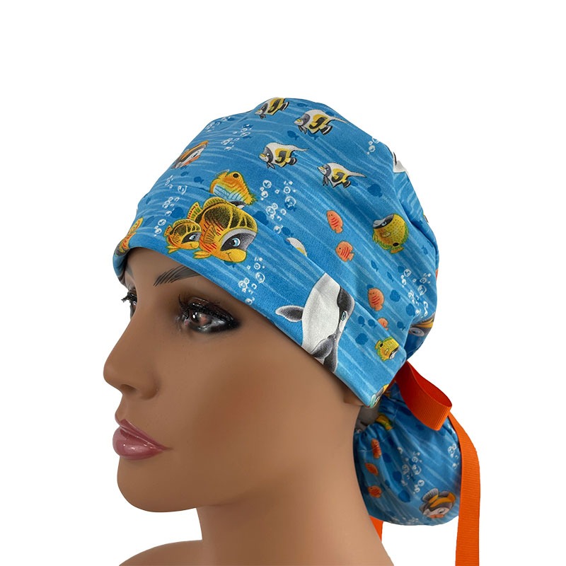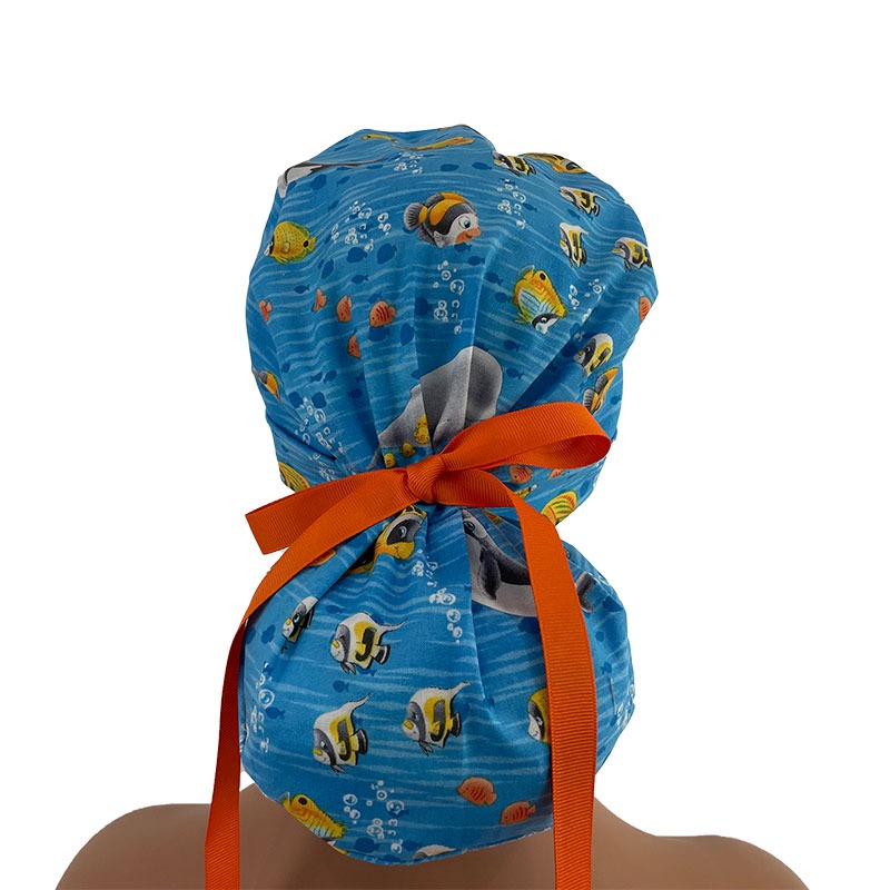 Turn Up Ponytail Medical Scrub Cap – Make A Splash – Ocean Life – Sky Blue