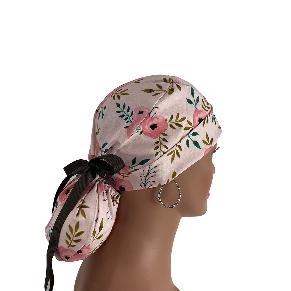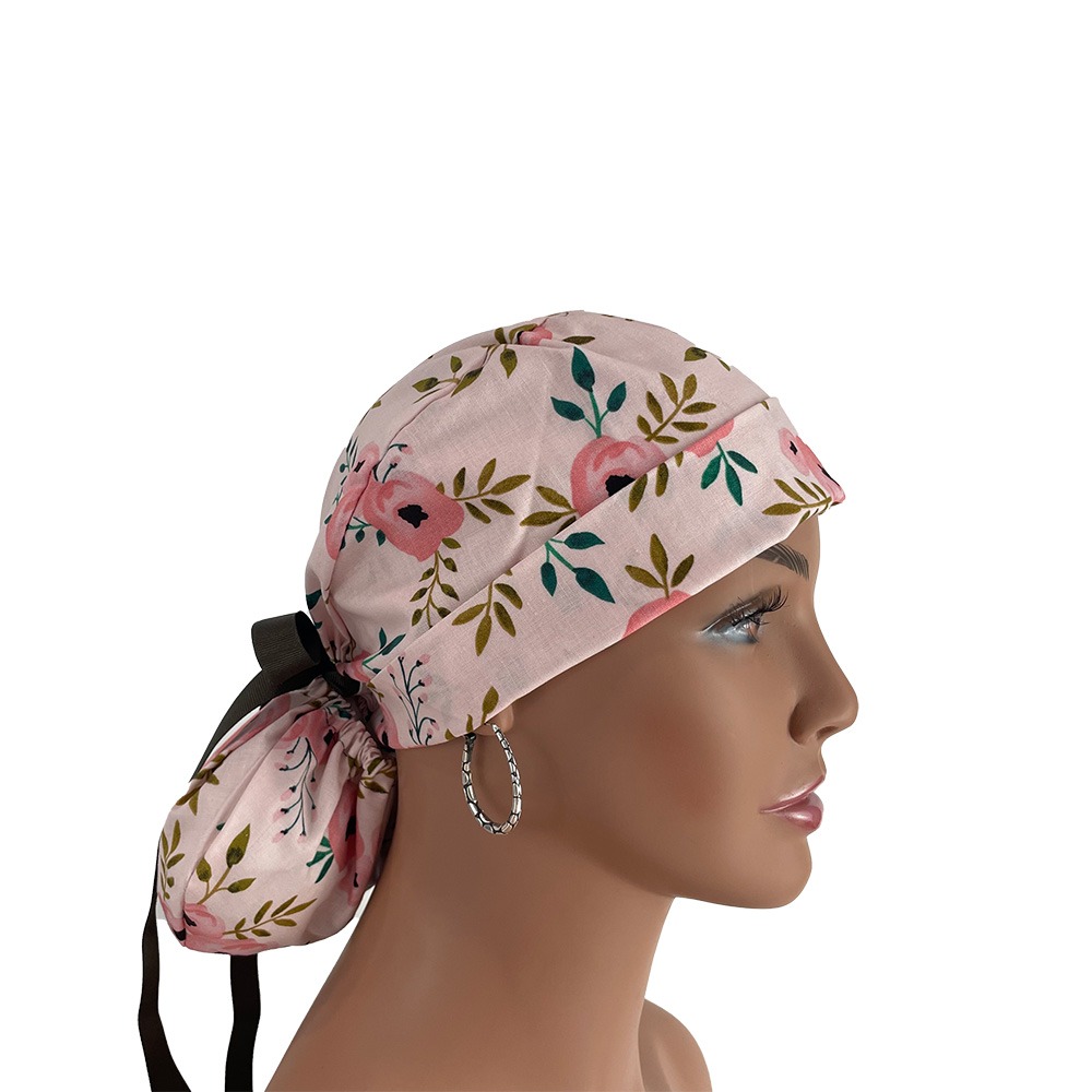 Turn Up Ponytail Medical Scrub Cap – Pink Poppy Flowers