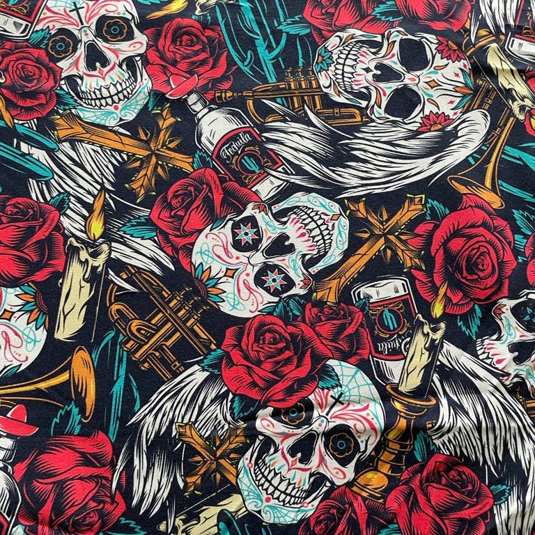 Turn Up Ponytail Medical Scrub Cap-Skulls Roses & Tequila – Black