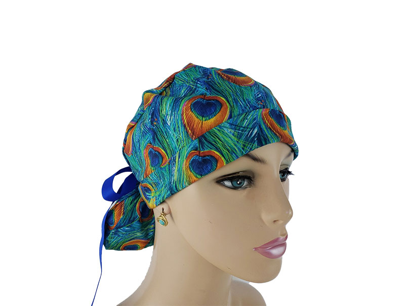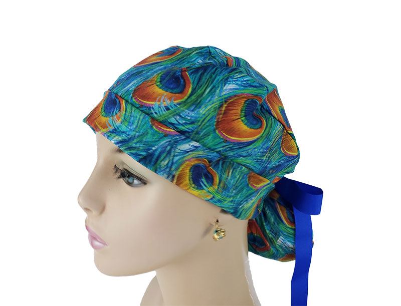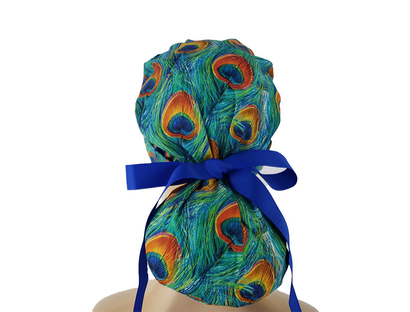Turn Up Ponytail Medical Scrub Cap – Watercolor Peacock Feathers – Turquoise